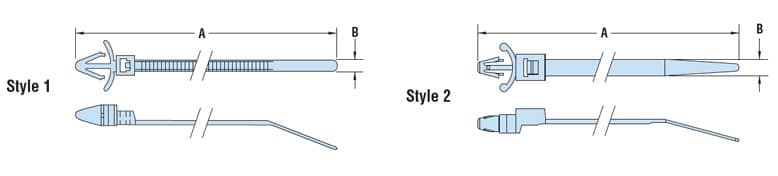 | Tensile Strength | Max. Bundle Diameter | Natural | UV Black | Heat Stabilized UV Black | A Length | B Width | C Spacer Height | Panel Thickness Range | Mounting Hole Dia. | |||||||||