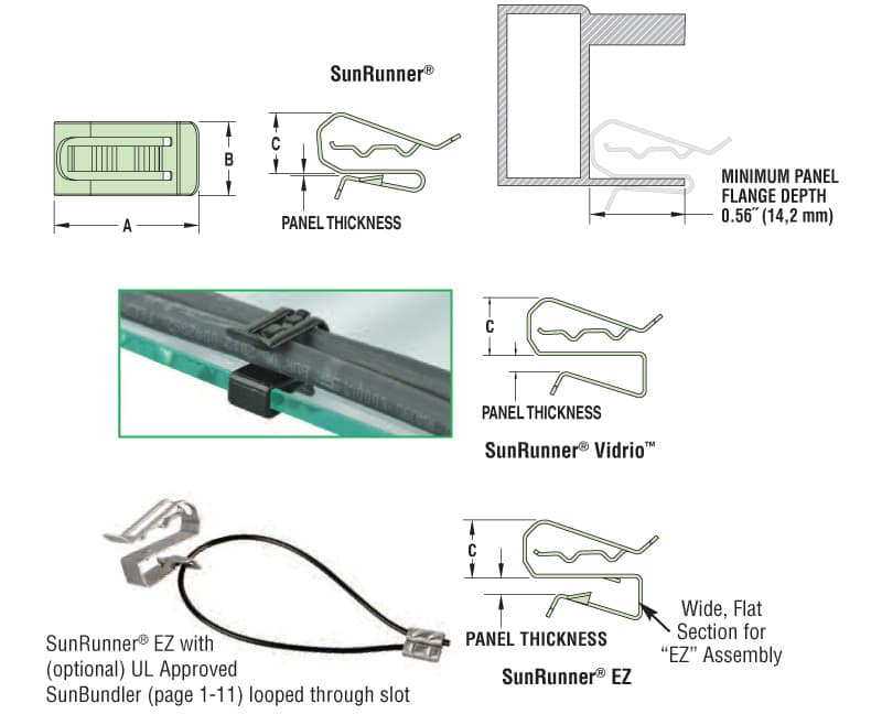 • SunRunner EZ’s are designed for thicker module frames as well as racking – accommodates profiles up to Wide, Flat .250˝ (6,4 mm) thick!