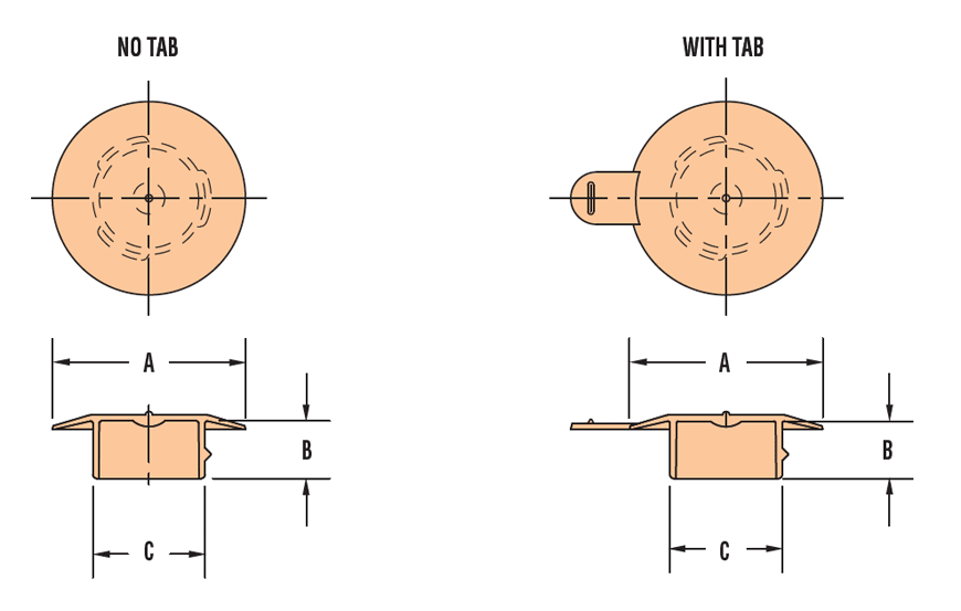 | Black No Tab | Black With Tab | A Head Diameter | B Overall Height | C Bottom Dia. | ||||||