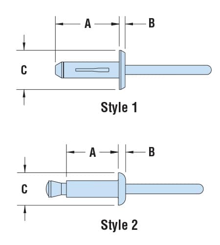 | Mounting Hole Dia. | ASSEMBLED PANEL THICKNESS | A Length | B Head Height | C Head Dia. | |||||||||