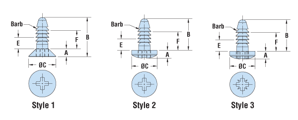 | Style | Threaded Hole Type | Clearance Hole ±.015 (0,4mm) | Min Panel Thickness E | Max Panel Thickness F | PART NO. | DESCRIPTION | PART DIMENSIONS | ||||||||||||||