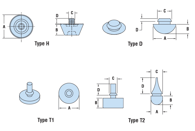 | Mounting Hole Dia. | Maximum Thickness | Black | A Base Diameter | B Base Height | C Insert Diameter | D Insert Height | ||||||||