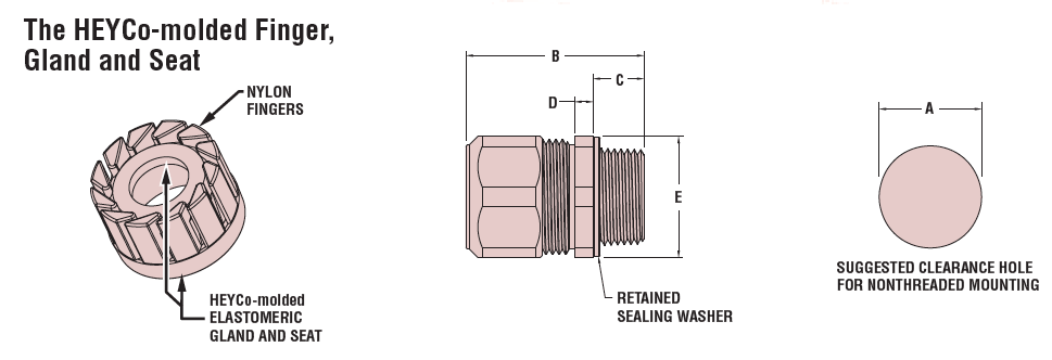 | Material | 303 Stainless Steel Body and sealing nut with nylon 6/6 and TPE co-molded finger/gland assembly SBR Sealing Washer | |