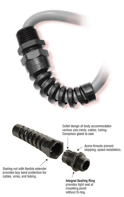 • Multiple sizes for flexible cord diameters ranging from .065″ (1,7 mm) to .705″ (17,9 mm).