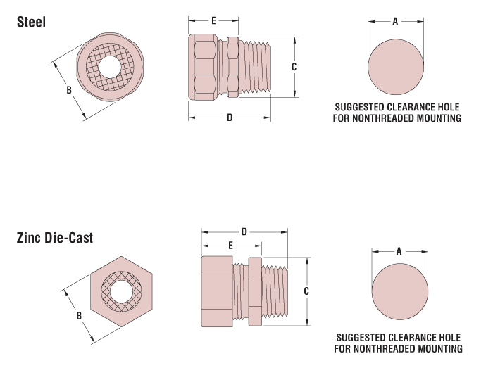 | A Clearance Hole Dia. | B Sealing Nut HEX | C Body Nut O.D. | D Overall Length* | E Exposed Length* | |||||||||||||
