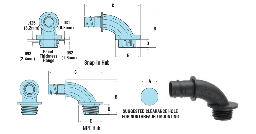 Heyco-Flex™ Quick Twist Conduit Fittings 90° Sweep, Snap-In and NPT Hubs