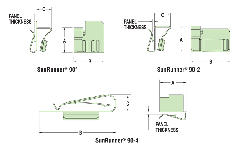 | Material | .025˝ thick 304 stainless steel (SunRunner 90° and SunRunner 90-2) .020˝ thick heat treated 410 stainless steel (SunRunner 90-4) |