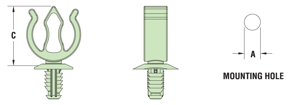 | PANEL THICKNESS RANGE | WIRE DIAMETER RANGE | PART NO. | DESCRIPTION | MOUNTING HOLE DIA. A | OVERALL HEIGHT C | |||||