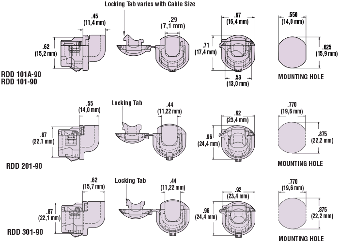 | WILL FIT THESE CABLES | PANEL DIMENSIONS | RDD LOCKIT STRAIN RELIEF for Faster Assembly | Corresponding Mounting Hole Plug | CAD | |||||||||